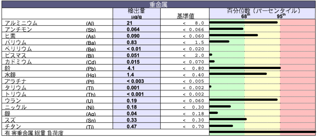 最も深刻だったのは、毛髪ミネラル検査によって明らかになった有害重金属の蓄積でした。