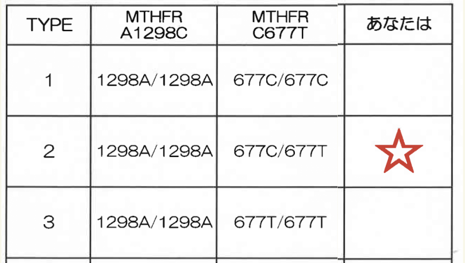 今回の検査では、解毒に関与するMTHFR遺伝子(C677T)にヘテロ型変異が確認されました(TYPE2)。