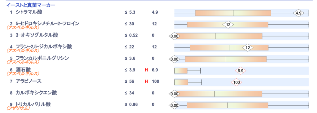 - 尿中の有機酸検査では、酒石酸やアラビノース(カンジダ菌の毒素マーカー)が基準値を大きく超えて検出され、カンジダ菌の過剰増殖が確認されました。