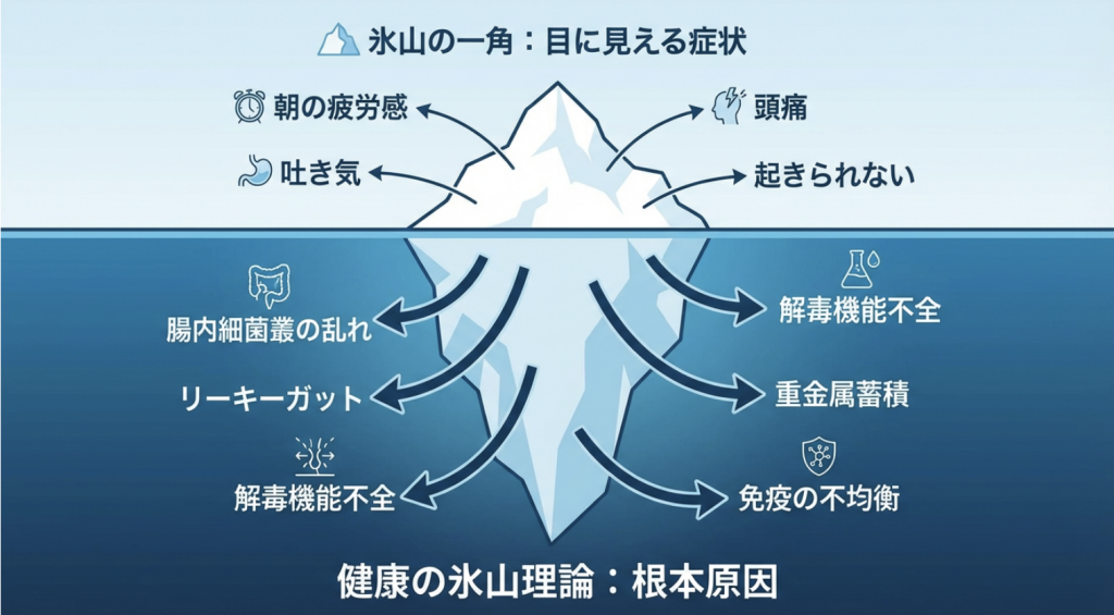 - 水面上の氷山 = 今感じている「朝起きられない」「吐き気」「頭痛」といった症状